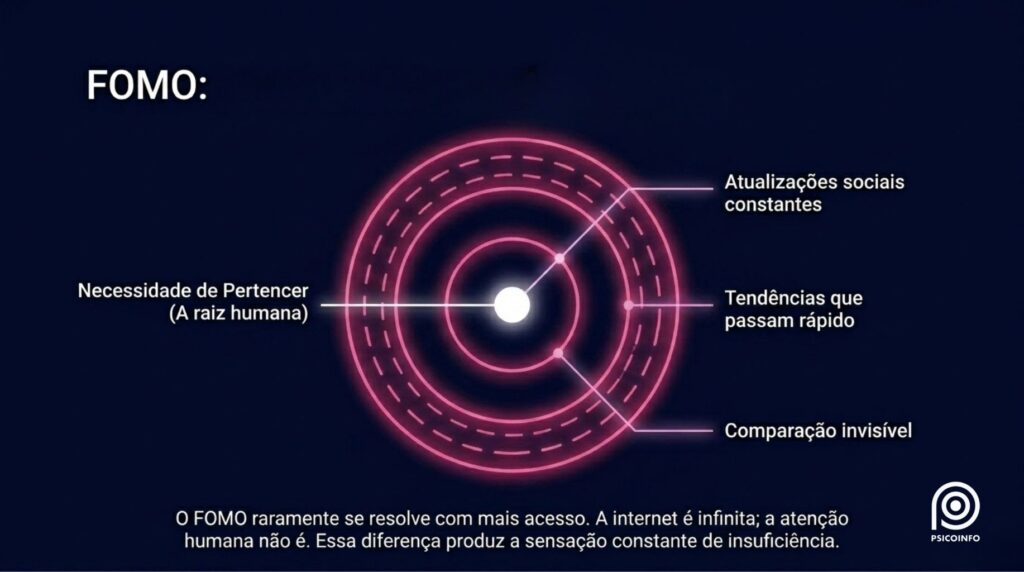 FOMO é o medo de estar sempre perdendo alguma coisa no mundo digital: uma conversa, uma notícia, uma tendência ou uma oportunidade. Nas redes sociais, a comparação constante, a atualização infinita e a sensação de urgência mantêm a mente em alerta, afetam a autoestima e aumentam a ansiedade digital. Leia o artigo na íntegra e entenda como esse ciclo se forma.